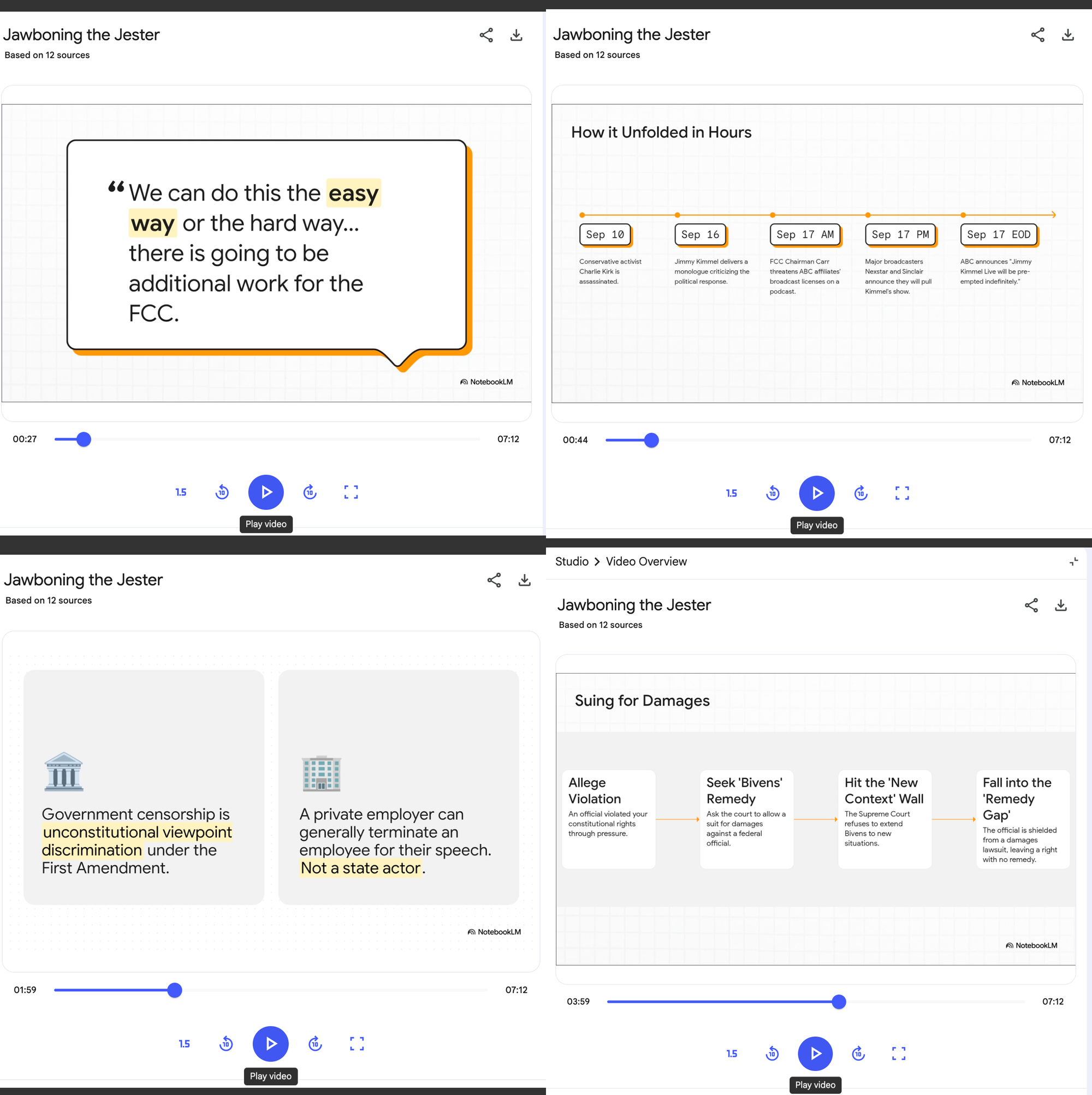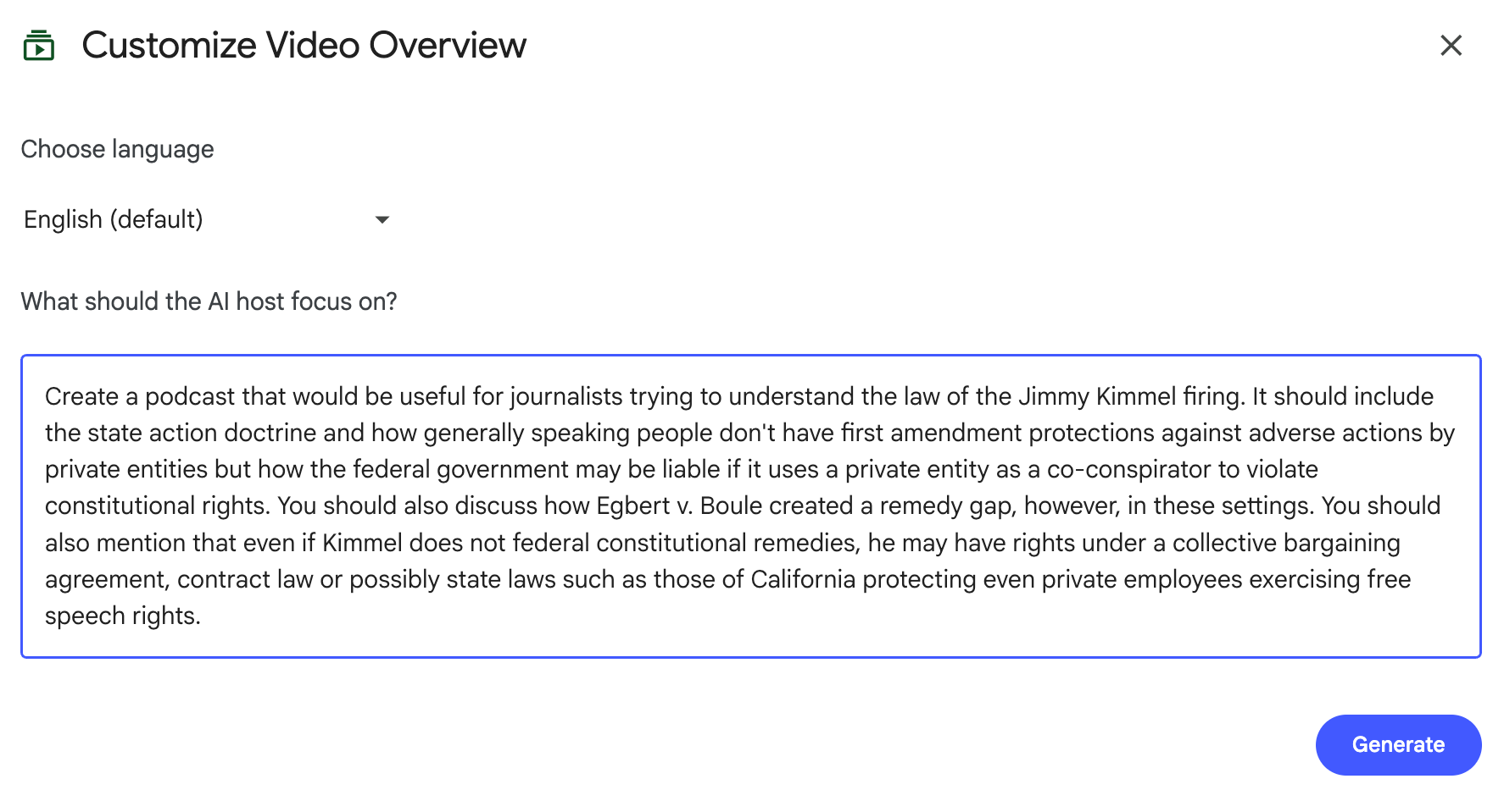 The other new feature of note is the ability to produce a video podcast. The quality here is not as high as for the audio versions, but it is still worth exploring. Here, I prompt NotebookLM to generate a video podcast for journalists who want to understand the legal remedies Jimmy Kimmel may have (or probably does not) under the Constitution and those he may have under state laws protecting private employee political activity.