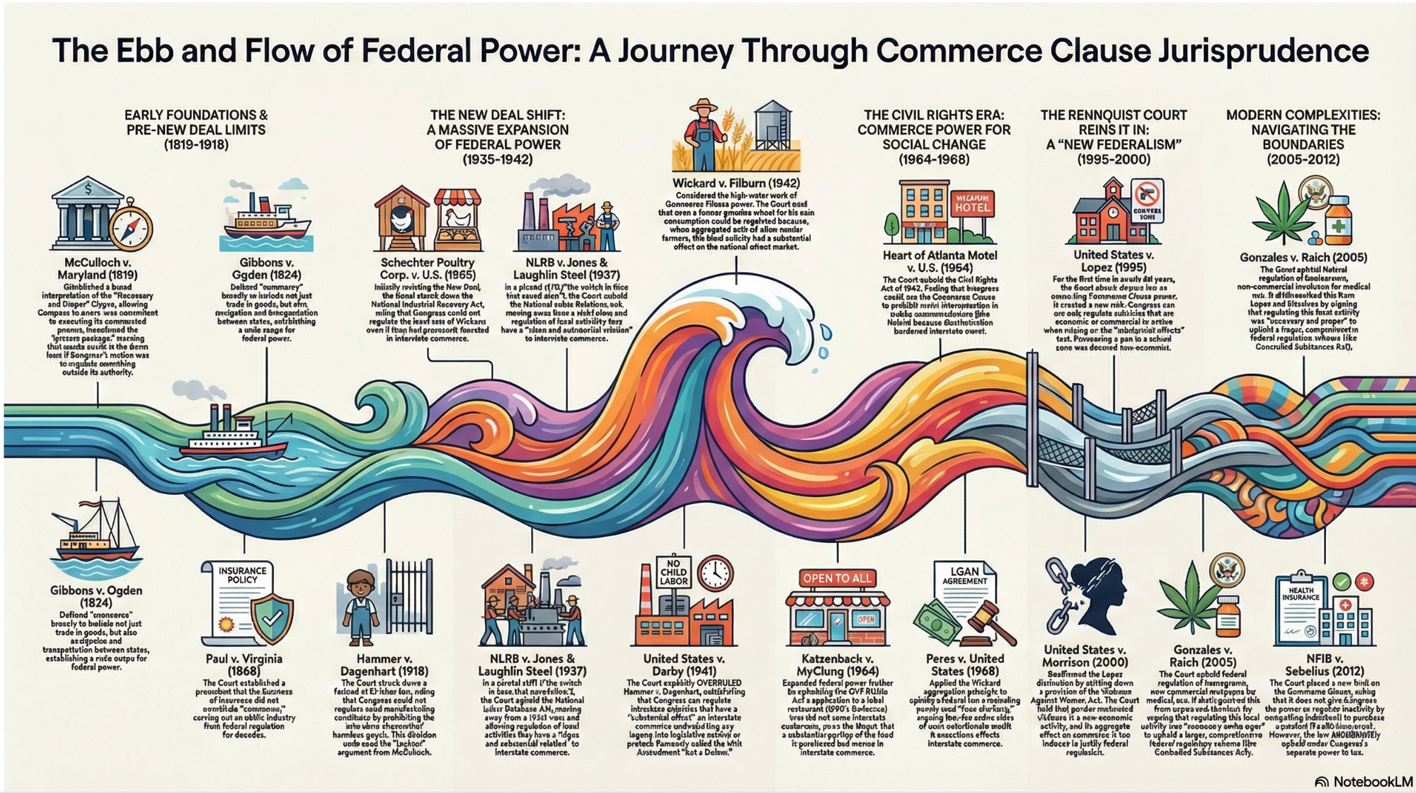 An infographic tracing the history of commerce clause decisions covered in class. (This one is cute but does have errors of duplication).