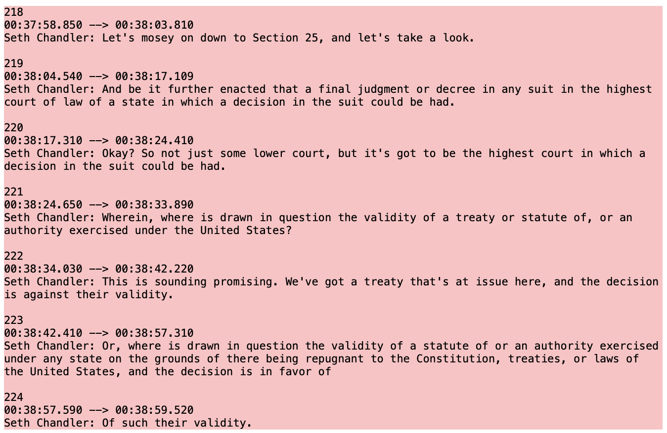 So now let's discuss how it was produced. Step one was to record every class on Zoom. I do this (1) for the convenience of my students who may miss class or want to review the pearls of wisdom emerging from the discussions; (2) for students with disabilities for whom a Zoom recording is a form of accommodation; and (3) for myself both for self-protection during these fraught times and so I can assess my own work. Unfortunately, the acoustics in my current classroom are such that Zoom tends not to pick up student comments, but at least it captures what I have to say. By default, Zoom produces a transcript of the class session. But it does so in a peculiar format called a VTT file. Here's what a conversation about Martin v. Hunter's Lessee (one of my favorite cases) looks like as raw text.